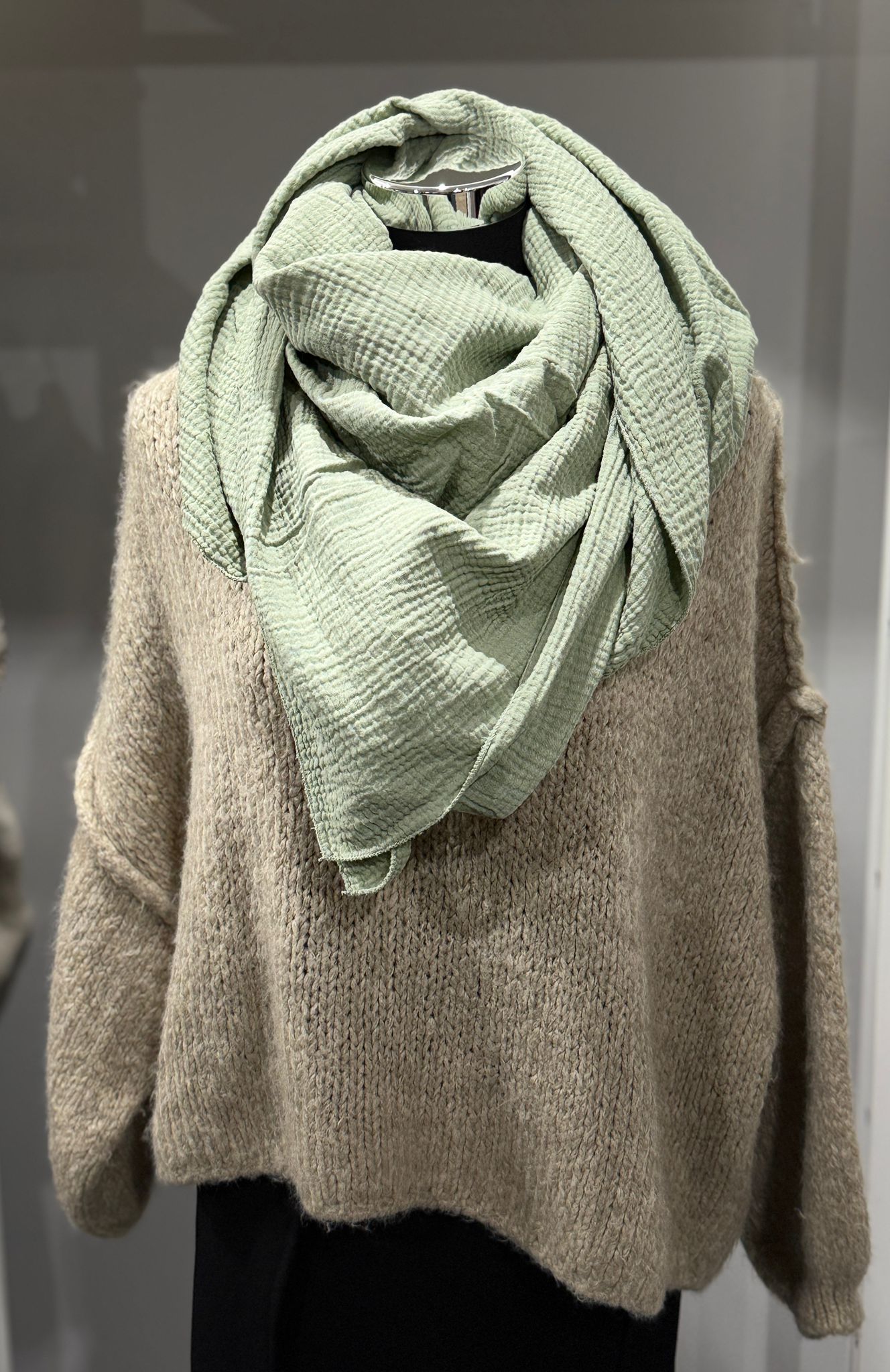 Dank seines großzügigen Formats lässt sich das Tuch vielseitig tragen: klassisch um den Hals, locker über die Schultern gelegt oder als modisches Dreieckstuch. Die sanfte Farbgebung macht es zu einem echten Kombinationswunder und passt sowohl zu schlichten als auch zu farbigen Outfits.