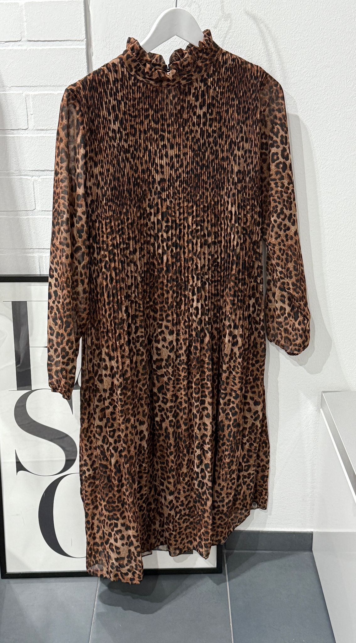 Dieses ausdrucksstarke Kleid im angesagten Leo-Print verbindet modischen Charakter mit femininer Eleganz. Der hochgeschlossene, leicht geraffte Kragen verleiht dem Design eine edle Note, während die feine Plissierung für eine fließende Silhouette und angenehme Leichtigkeit sorgt.